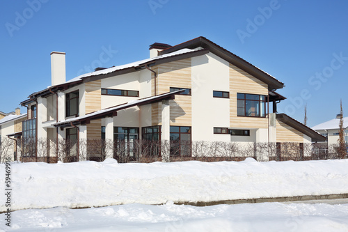 Modern Cottage With Big Windows At Frosty And Sunny Winter