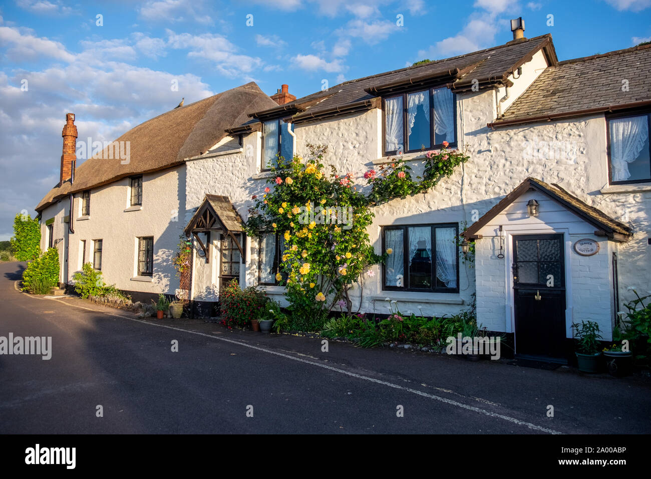 Old Thatched English Cottage Next To A Modern Cottage Stock